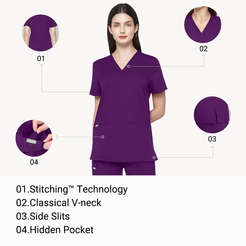 Comenii medical scrubs engineered by Poradex™ technology, it combines polyester, cotton and spandex, where the fabric is with 4-way stretch, wrinkle resistant and odorless performance and make your skin breath all day.