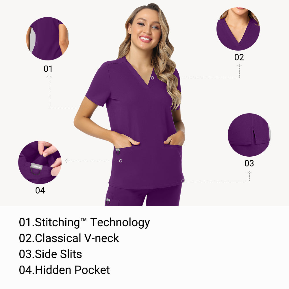 Comenii medical scrubs engineered by Poradex™ technology, it combines polyester, cotton and spandex, where the fabric is with 4-way stretch, wrinkle resistant and odorless performance and make your skin breath all day.