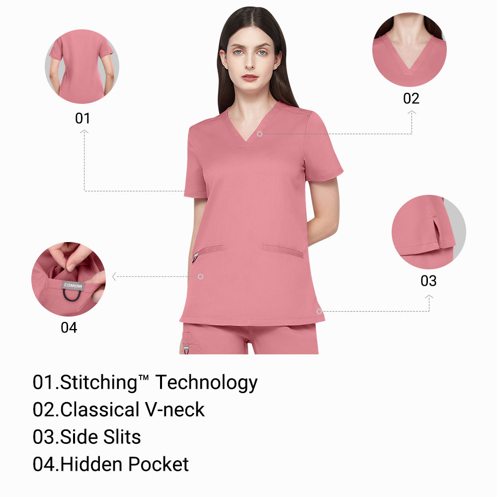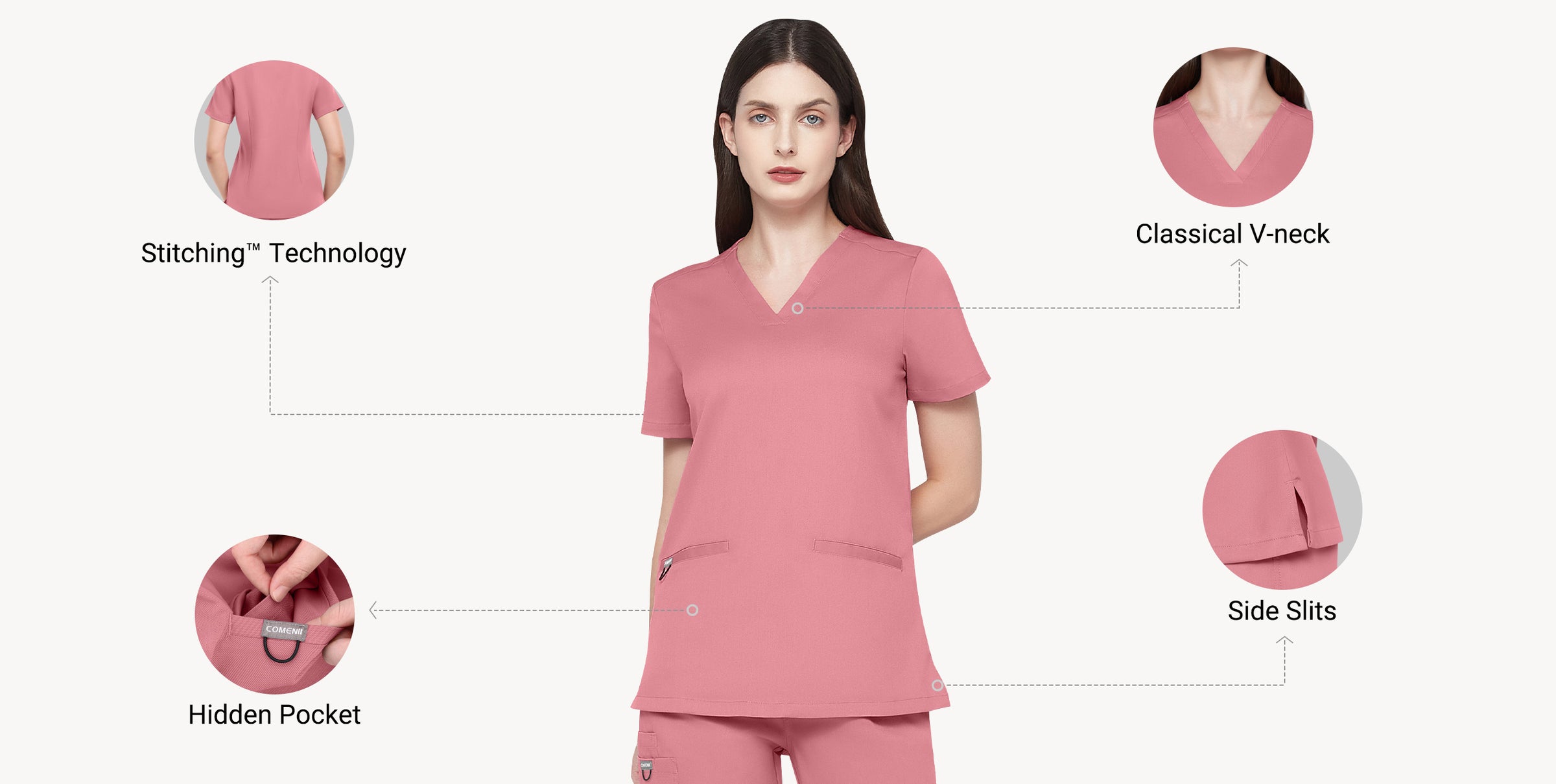 Comenii medical scrubs engineered by Poradex™ technology, it combines polyester, cotton and spandex, where the fabric is with 4-way stretch, wrinkle resistant and odorless performance and make your skin breath all day.